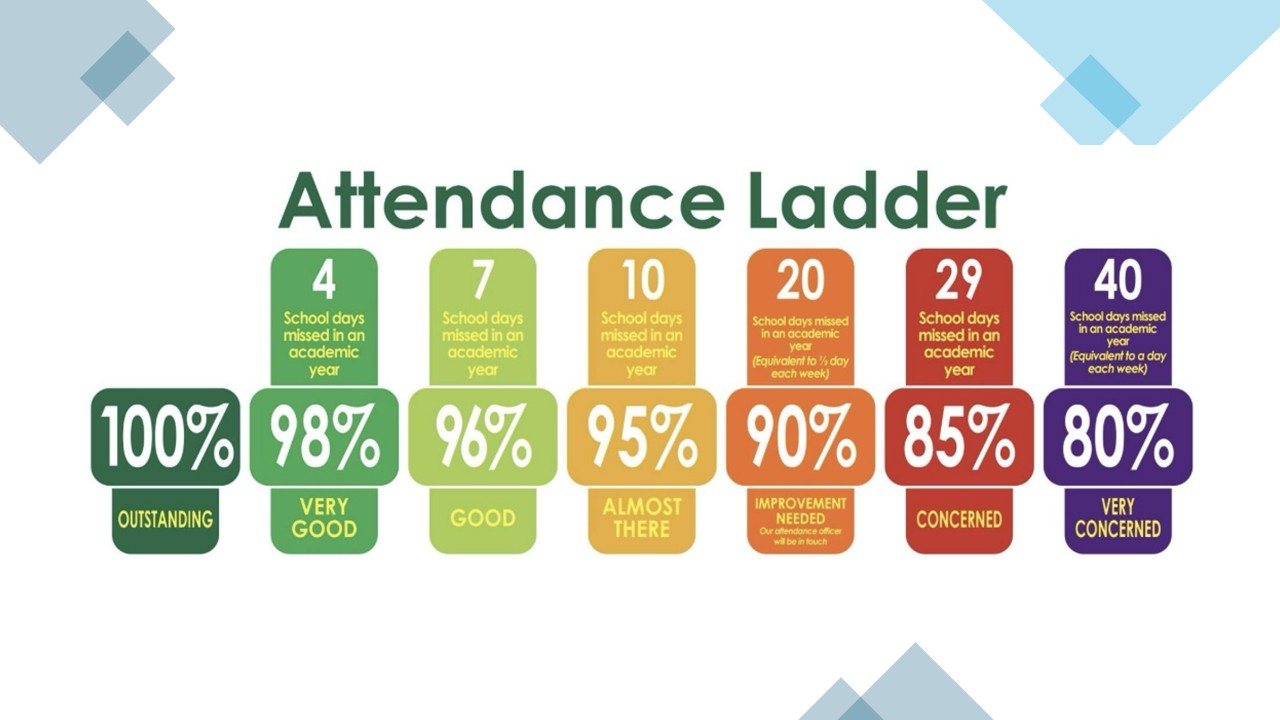 It is vital that your child is on time and in school every day. If your child is not in school we cannot teach them. If they are late they will miss the start of the lesson and could struggle to keep up with the rest of the children. Some parents / carers believe that being absent from school occasionally sometimes is ok but these days soon add up. Good attendance is vital if your child is to achieve and make good progress.